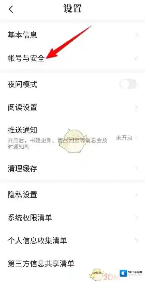 2、接着来到设置的页面,我们需要点击的功能是账号与安全;