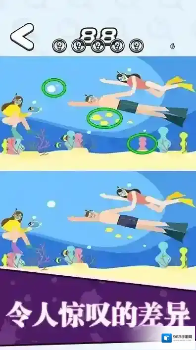 1、操作方式简单直观,点击标记差异位置,双指缩放查看细节,滑动切换对比区域。误点惩罚机制防止盲目猜测,培养真正观察力。