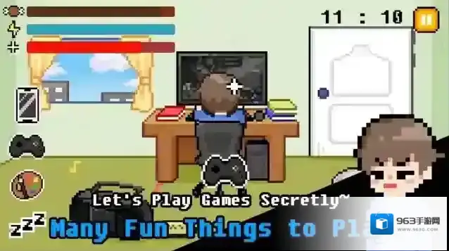 1、趣味伪装玩法:玩家需要在家长严密监视下巧妙隐藏游戏行为,通过快速切换界面(从游戏切回书本)等精细操作,躲避突如其来的检查。