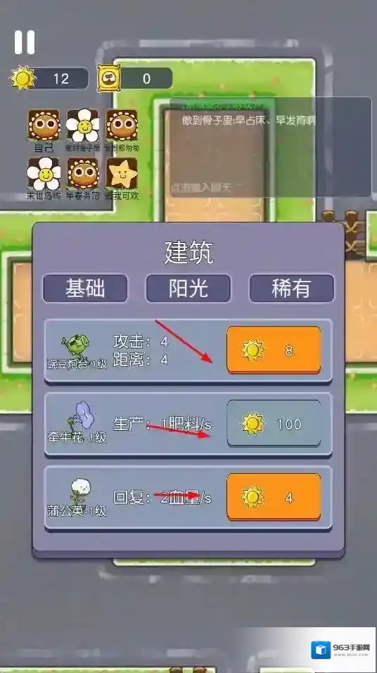 1、“种植植物”,消耗阳光,在领地种植豌豆炮台(攻击)、牵牛花(产肥料)等植物,构建防线。