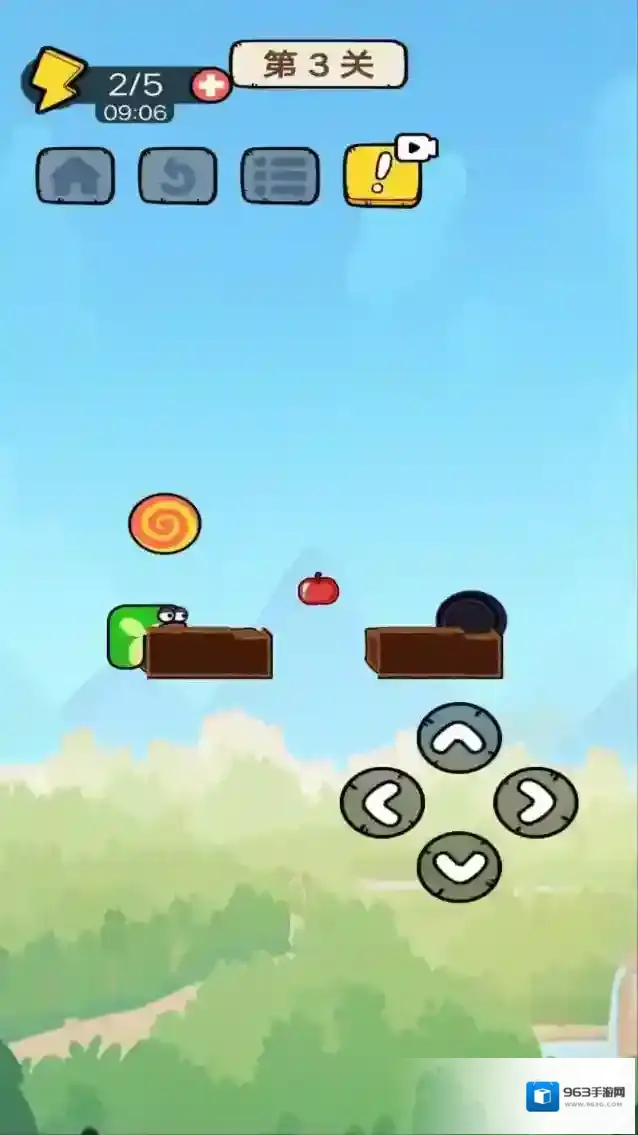 2、第3关用虚拟按键,控制绿色蛇形角色(箭头指向),躲避障碍(苹果、轮胎),收集糖果。