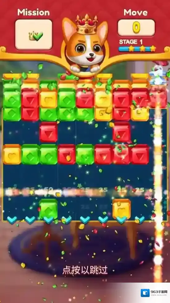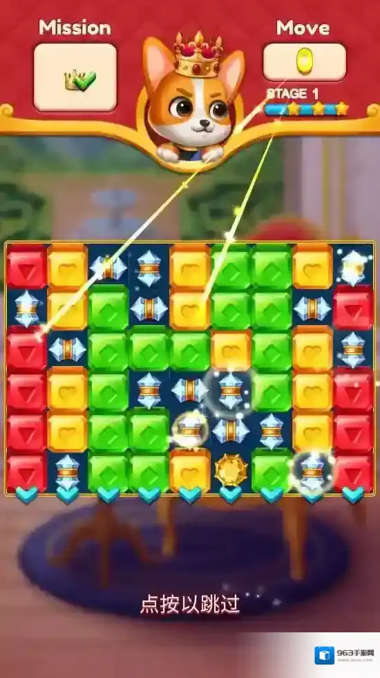 2、关卡内珠宝与城堡元素交织,尝试交换相邻珠宝,让三颗及以上同色珠宝相连,就能看到它们爆破消除时的萌趣效果。