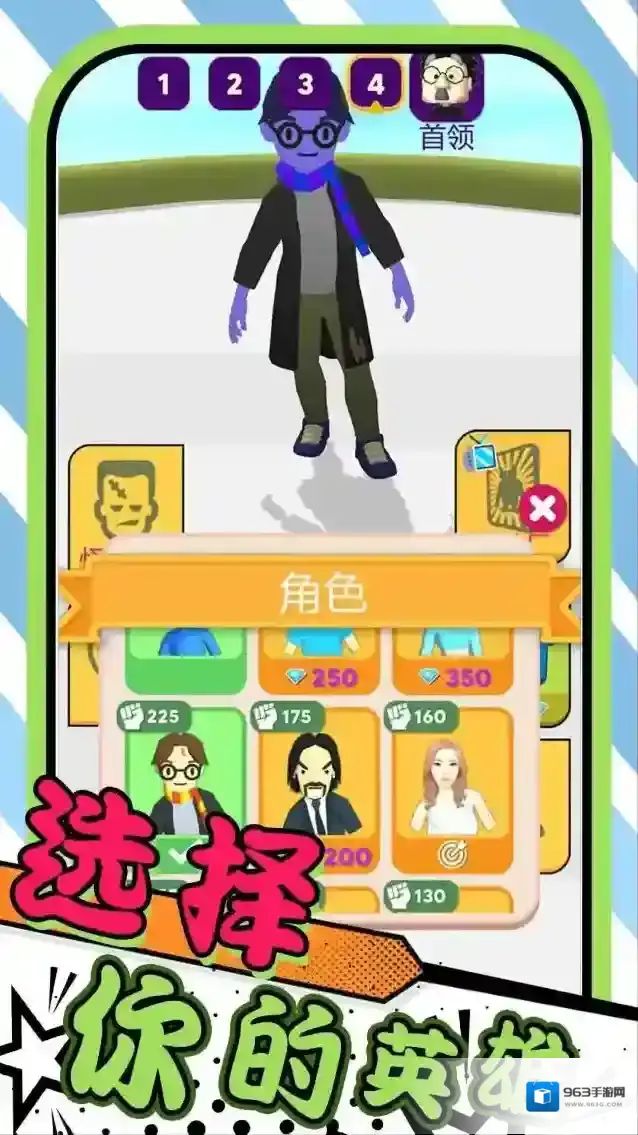 2、进入角色界面后,查看不同角色的属性,选择合适的角色(如箭头指向的戴眼镜角色),花费对应货币解锁并替换,增强角色实力。
