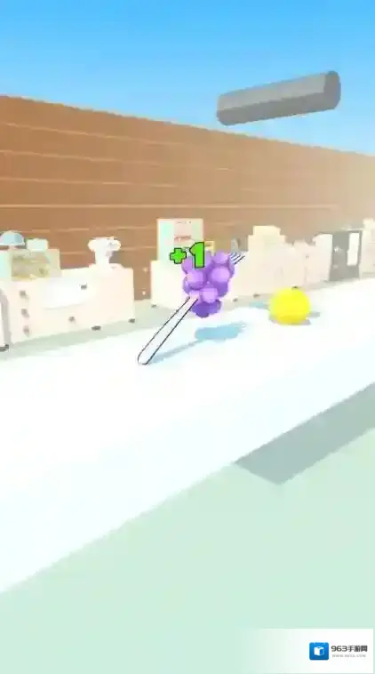 2、叉子成功接住蛋糕,继续沿轨道前行,过程中留意“+1”标识区域,引导叉子经过该区域,收集增益效果,助力后续跑酷闯关。