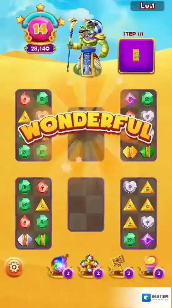 1、埃及风格设计:消除元素融入金字塔、法老面具等古埃及符号,背景画面呈现沙漠、神庙等场景,浓郁的异域风格让视觉体验独特,沉浸感十足。