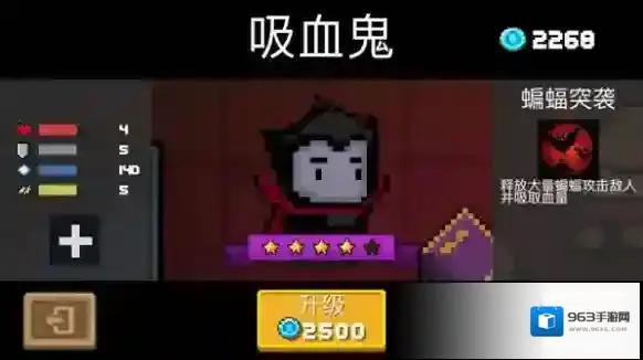 技能1:蝙蝠突袭:释放大量蝙蝠攻击敌人并吸取生命值。满级后蝙蝠数量提升。(血量满时蝙蝠吸取能量)