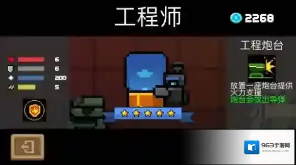 技能1:工程炮台:放置一座炮台提供火力支援。满级后炮台能放出导弹。