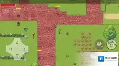 3、呈现角色(像素人物)、场景(草地、树木、道具木桶)、操作按键等,是角色在场景互动、探索的界面,玩家可操控角色移动、互动,开展生存或冒险玩法。