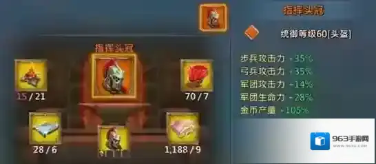 这个金色级别的钉锤是需要我们的统领达到六十级可以佩戴的,在佩戴之后在去统领兵团可以获得加成,当统领使用碎颅者的时候统御弓兵的时候,这个军种的攻击就提高15%,当统领使用碎颅者的时候统御的步兵时候,这个军种的防御就是提高25%让这个军团可以在前面抗的更久保证我们的弓兵军团的输出。