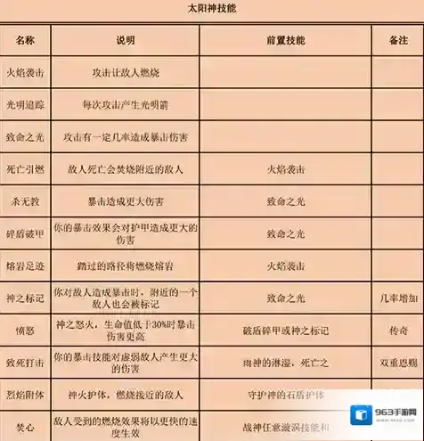 太阳神技能属于光火系。主要针对伤害提升、附属伤害、范围伤害、追踪伤害,是每个大关卡提升实力的关键技能。