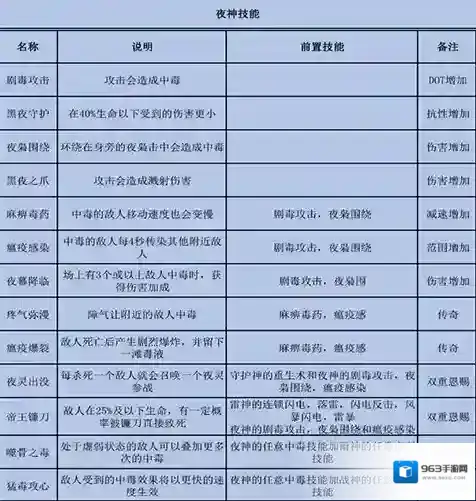 夜神技能具有毒系攻击和溅射伤害的特点。其中,黑夜守护技能是低血量时的保命神技,非常实用。